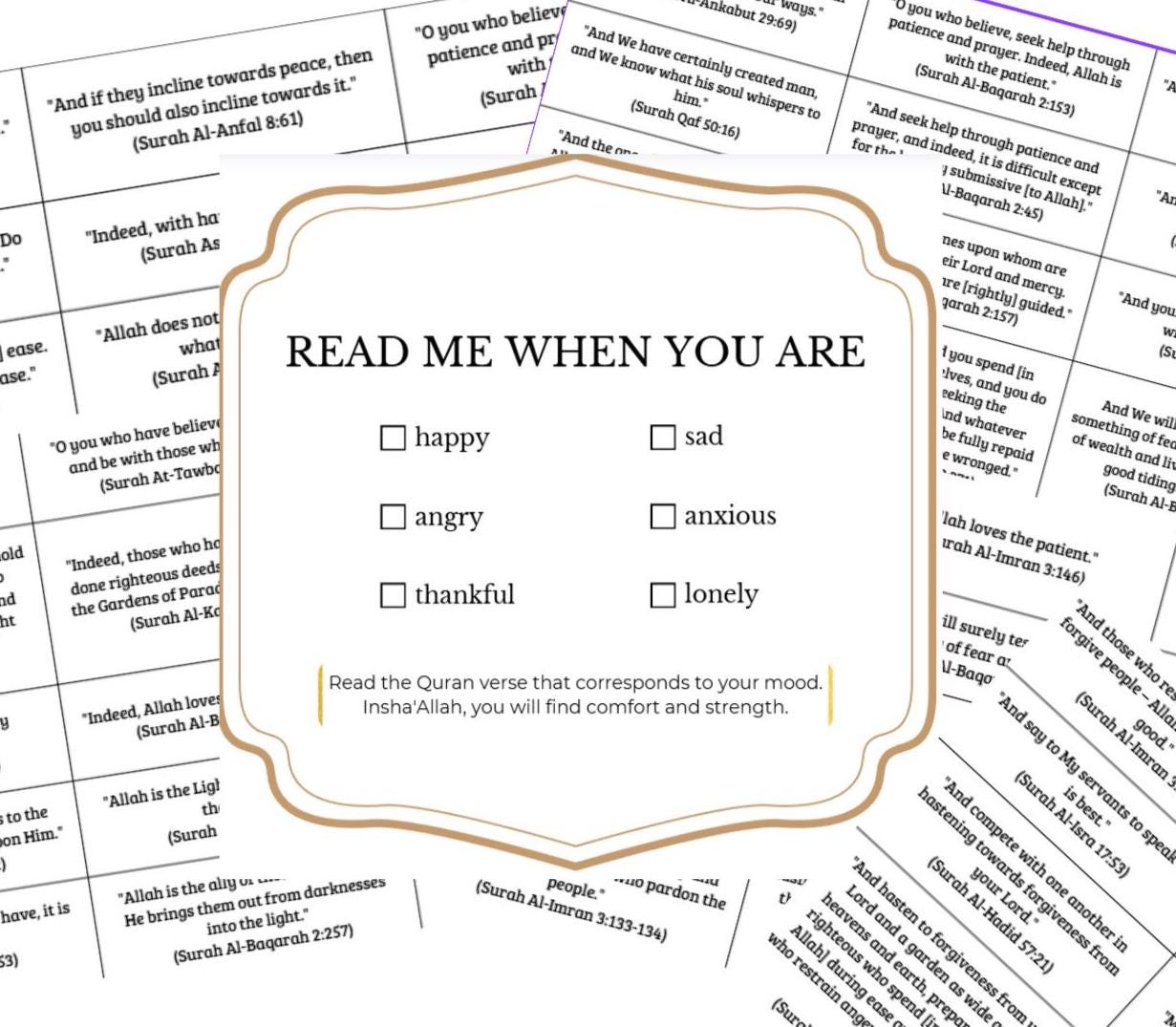 🌙 DIGITAL PDF with 150+ Quran verses based on emotional states. Ready to print, with 6 colors for categorization. IN ENGLISH, ideal for gift jars.